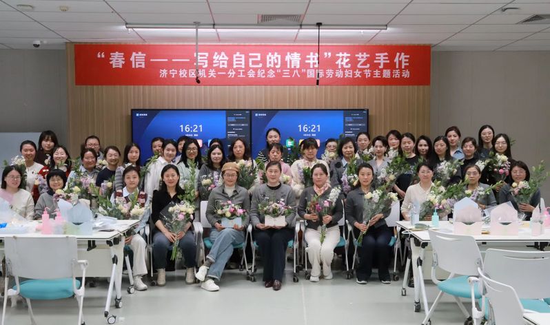 • 春和景明,万物生辉。为纪念第116个“三八”国际劳动妇女节,致敬每一位坚守岗位、绽放芳华的女职工,3月26日下午,济宁校区机关一分工会举办“春信——写给自己的情书”主题花艺手作活动。全体女职工齐聚一堂,在花香与诗意中,赴一场与自我的温柔邂逅。一百一十六年来,“三八”国际劳动妇女节见证着女性从争取权利到自我实现的壮阔历程。本次活动以这一特殊节点为契机,以“信封花盒”为诗意载体,将传统书信文化与当代花艺美学巧妙融合,倡导女职工在动手创作中完成自我对话,感受“被凝固的时光”之美,唤醒内心对自我价值的认同与关爱。活动在“听·花信风起”中拉开序幕。高级花艺师、中国传统插花非遗项目传承人、济宁市插花艺术研究会会长耿春燕为大家娓娓道来“二十四番花信风”与“十二花神”的古老传说,带大家了解自唐宋以来花期与节令的紧密相连,认识每个时节极具代表性的花卉,也一同感受“十二花神”体系所承载的中国人自古的爱花传统与花神信仰。女职工们沉浸在花与诗的交融中,静静品味传统文化里那份细腻而绵长的时序之美。随后,“赏·枝条之美”环节将中式插花的意境徐徐展开。中式插花以线为骨,讲究自然写意与意境留白,从枝条的骨相到空间的留