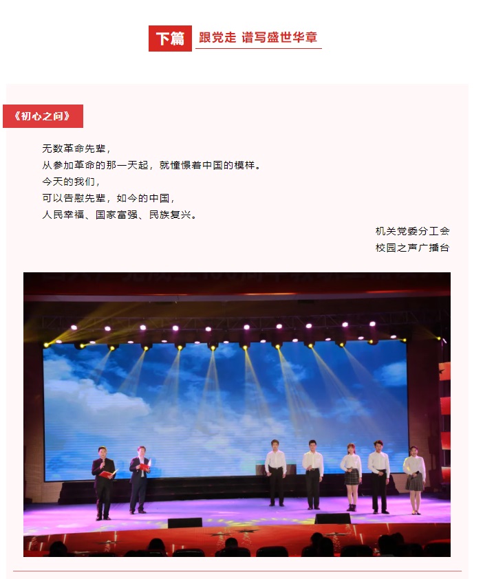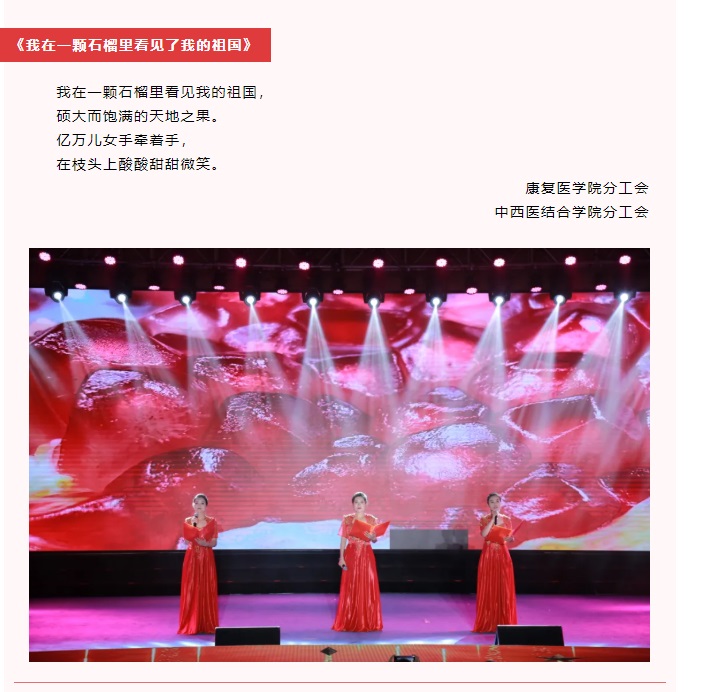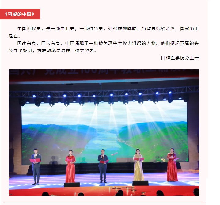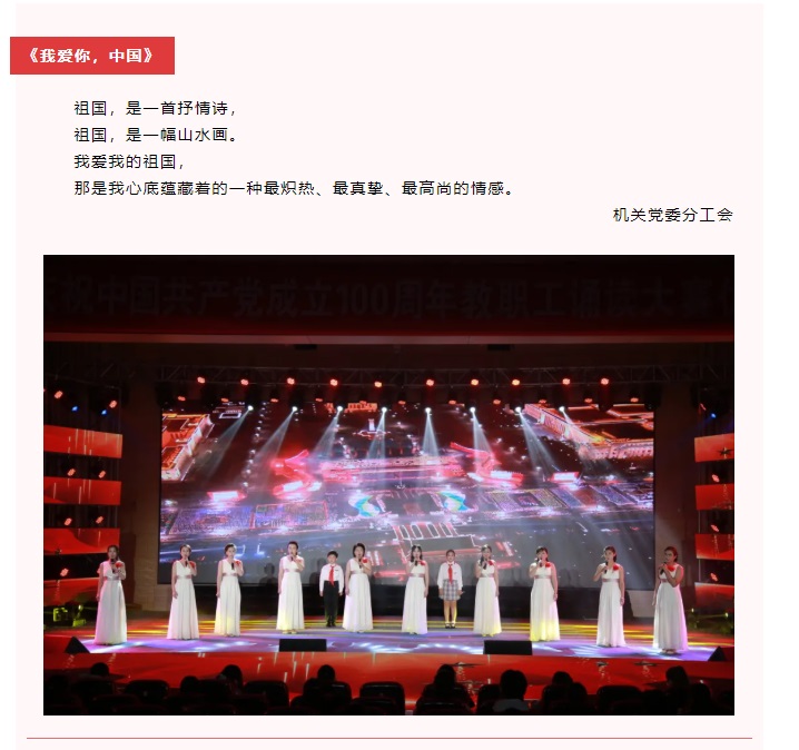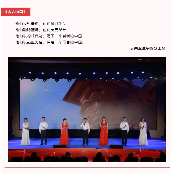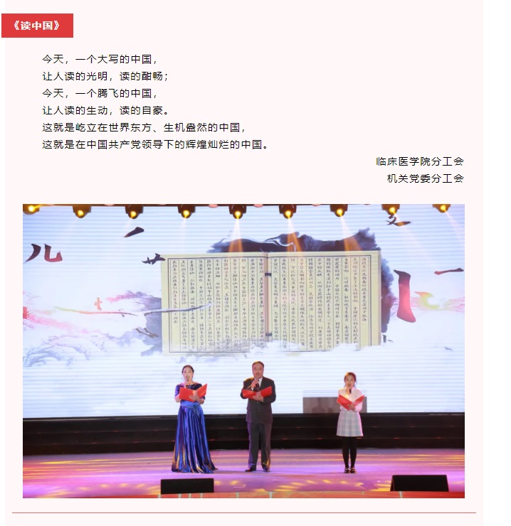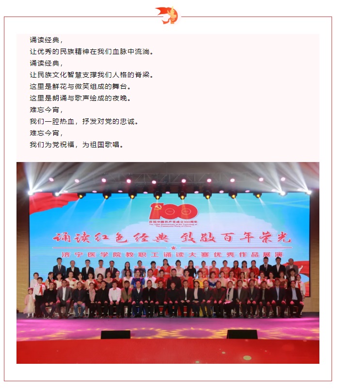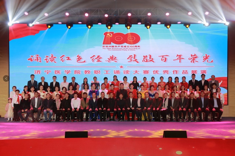 “诵读红色经典,致敬百年荣光”济宁医学院庆祝中国共产党成立100周年教职工诵读大赛优秀作品展演11月11日在太白湖校区隆重举行。学校党委副书记、院长姚庆强,党委副书记刘军,党委委员、副院长、附属医院党委书记崔文,党委委员、宣传部部长曲相艳,党委委员、统战部部长陈晓东,各部门、单位负责人、部分教职工代表和近200名学生观看展演。