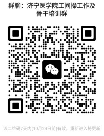 (三)做好参训骨干推荐工作。请各分工会按照以下要求做好参训骨干推荐工作:济宁校区机关一、二分工会每个部门推荐1人,后勤管理处分工会推荐1-2人,日照校区机关分工会及各二级学院分工会推荐2-4人。请各分工会文体委员及参训骨干于10月24日前扫描下方二维码入群并将昵称改为“***工会+姓名”。